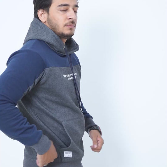 The standout feature of this hoodie is the sophisticated color-block design, combining deep Navy Blue and classic Heather Grey. This two-tone split provides a modern, athletic look that is far more impactful than a solid-color hoodie.