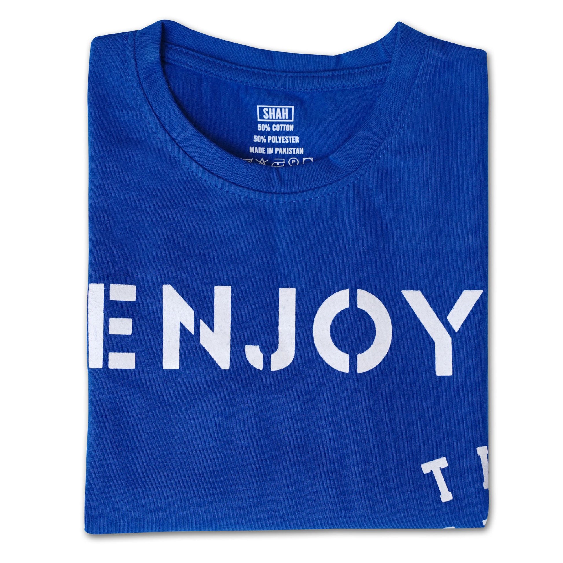 Bold Graphic: Features a crisp white "ENJOY THE RIDE" print and a cool, matching blue and yellow bicycle wheel graphic.