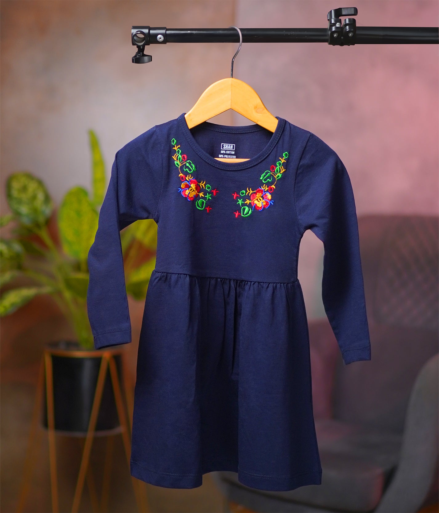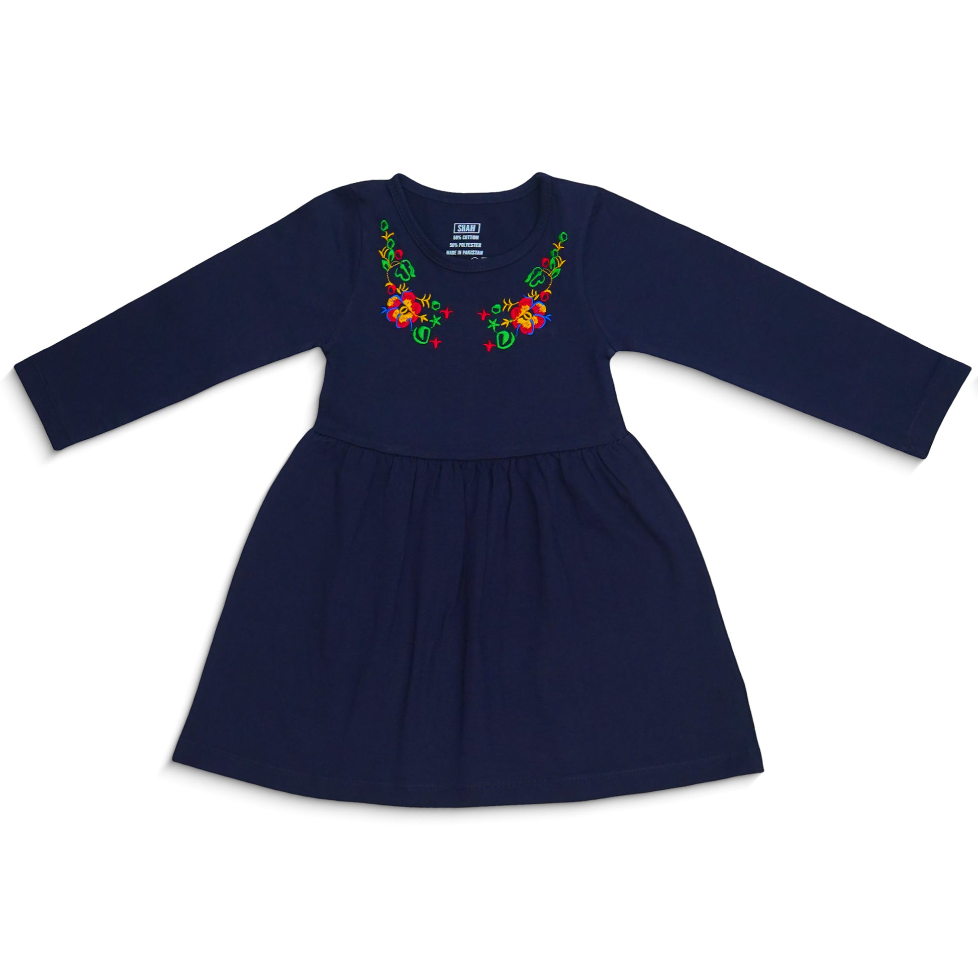 This elegant two-piece set features a beautiful navy blue frock with intricate folk embroidery on the yoke, paired with comfortable matching trousers. Perfect for both casual and special occasions, this outfit combines traditional charm with modern style, ensuring your little one looks adorable and feels great all day long.