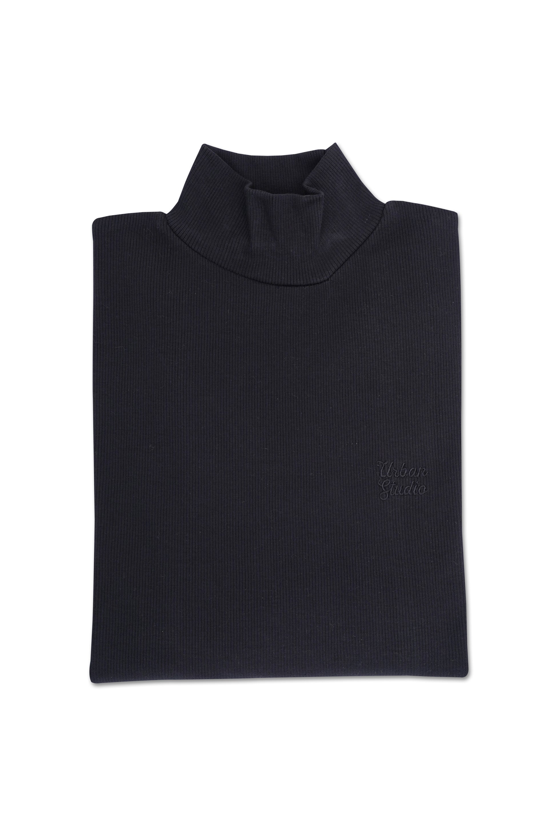 Long-Tail: Men's black stretch mock neck, ribbed cotton blend black jumper, classic black pullover